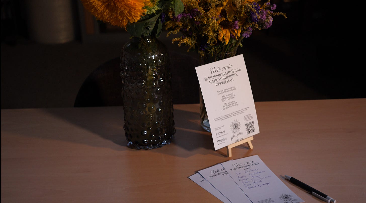 🌻29 серпня. Масштаби турботи і поваги до пам’яті: я пообіцяла рідним, які не можуть особисто вписати імена на листівках Столів пам’яті, що відвідаю заклади, щоб записати їх замість них. Так я побувала в усіх закладах поблизу нашого офісу.