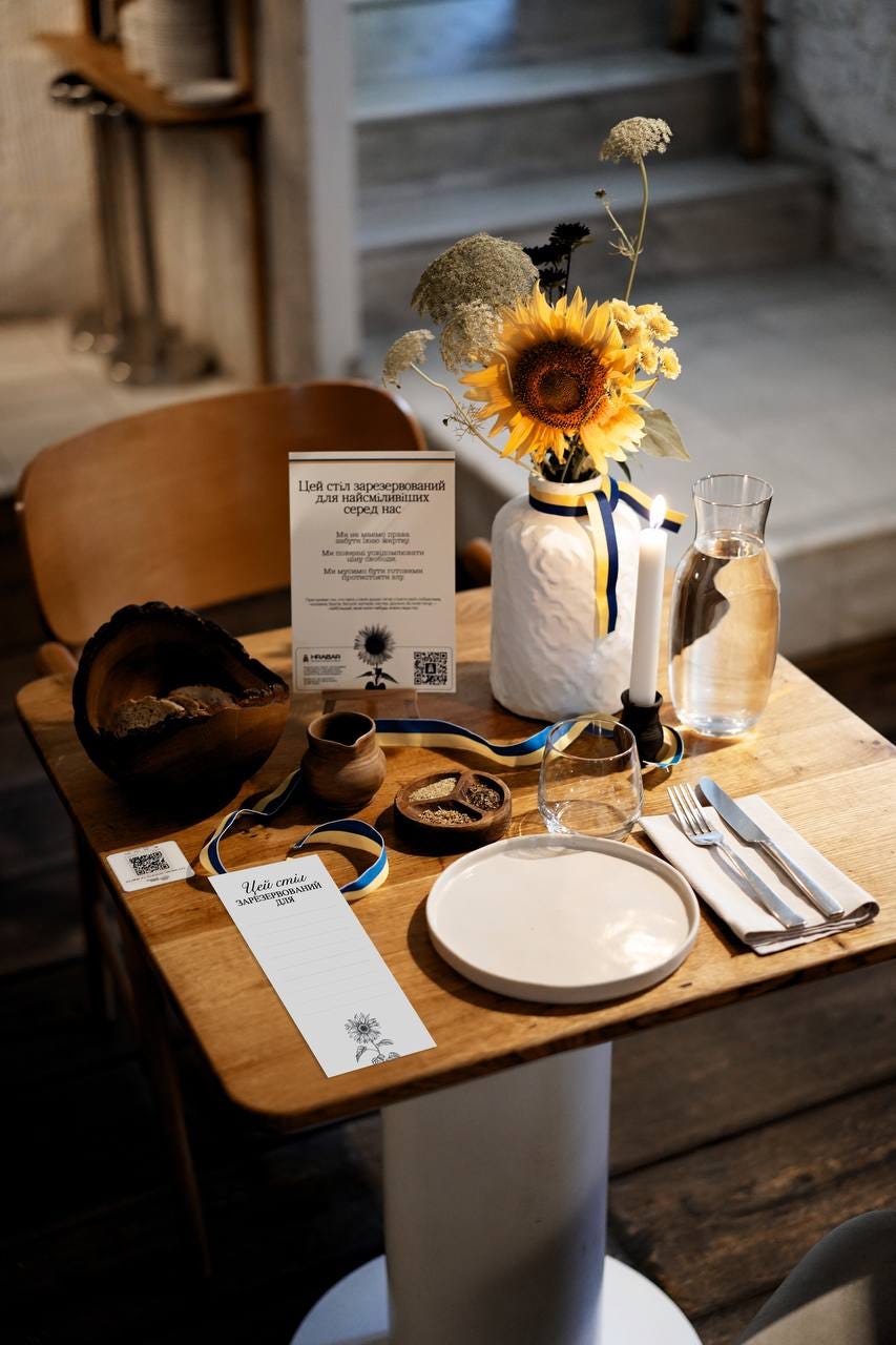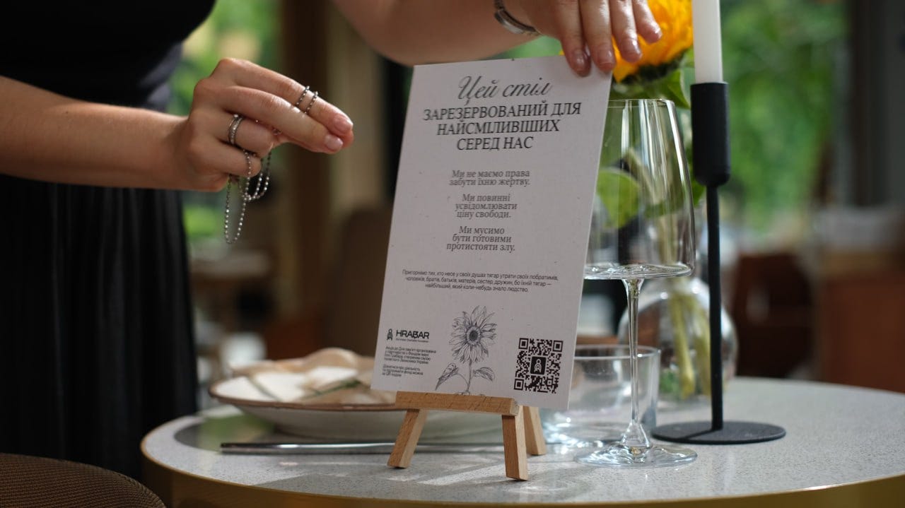 Ми пропонуємо зарезервувати один столик у вашому закладі (організації) і засервірувати його у пам’ять про полеглих героїв – покласти соняхи, свічку, табличку «Цей стіл зарезервовано для найсміливіших серед нас» і листівки, де можна записати імена полеглих. Стіл пам’яті можна присвятити усім героям, а можна – комусь конкретному, кого ви хочете згадати цього дня.