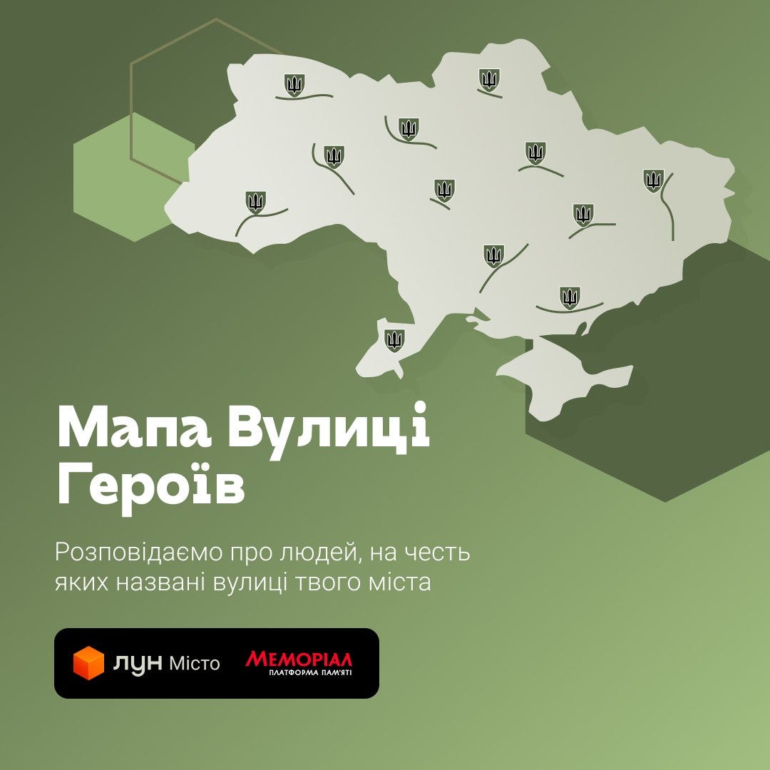 Ще одна частина моєї роботи – зберігати дані про вшанування у формі меморіальних дошок, перейменованих вулиць, парків, скверів. Імена героїв, які вшановані у перейменованих вулицях, нанесені на Мапу Вулиці Героїв – це проєкт Меморіалу та ЛУН, куди я регулярно передаю інформацію.